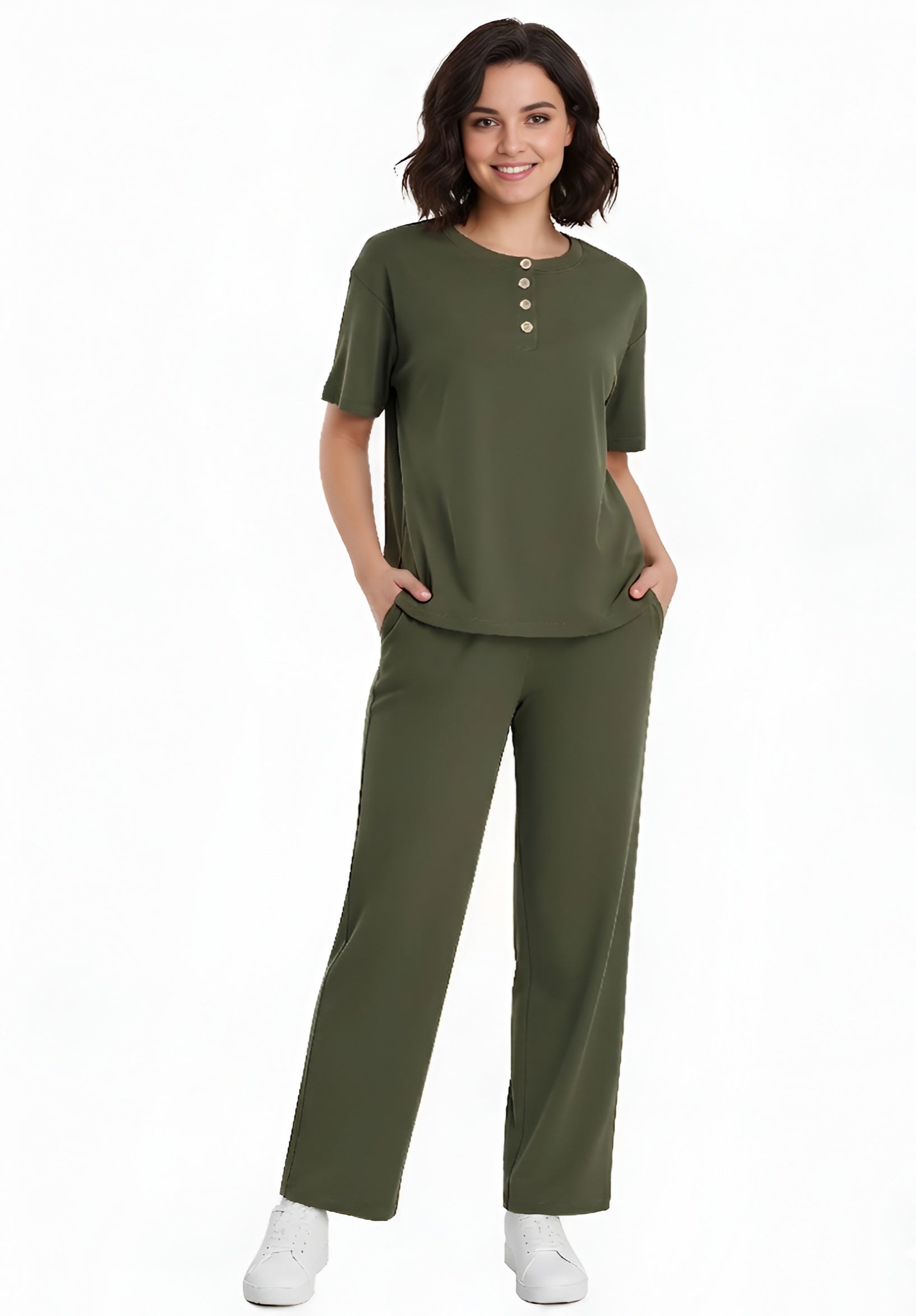 Top features a classic round neckline, short sleeves, and stylish button detailing.