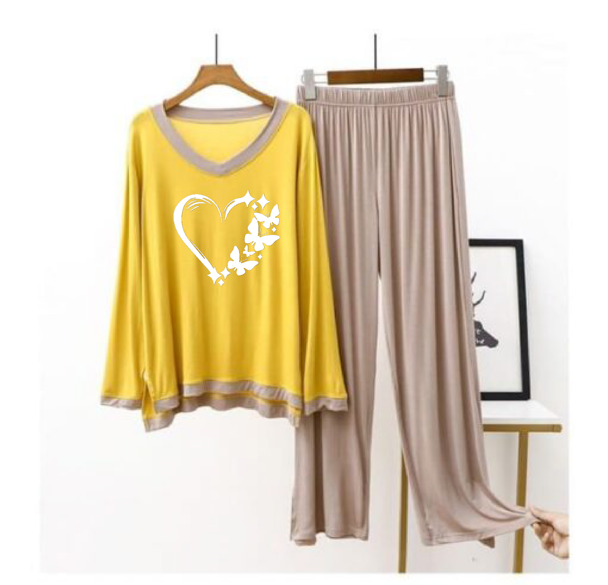 Heart Printed Yellow V Neck With Skin Contrast Palazzo For Women PJ Set