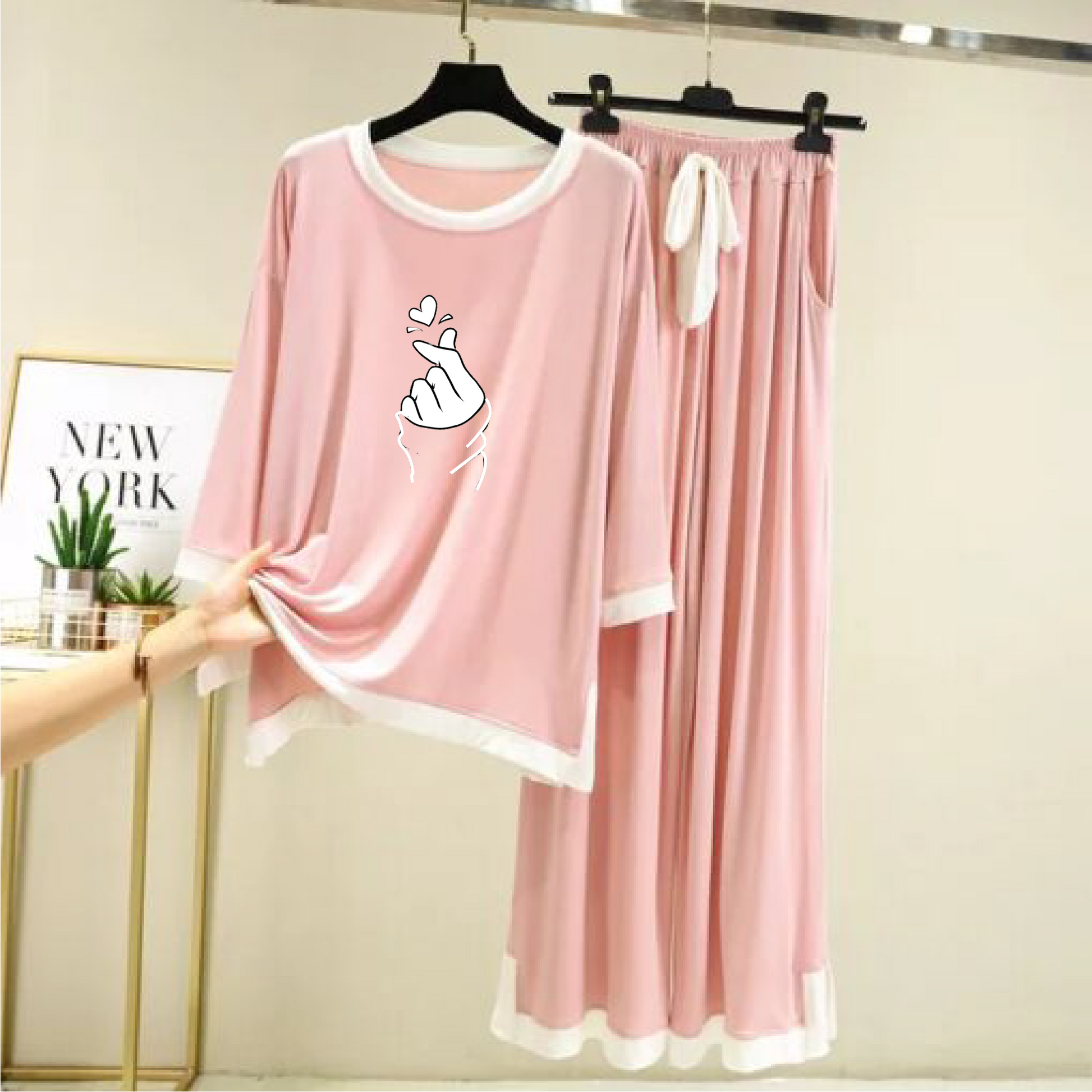 Love Heart Printed Full sleeves Pink with White Round Neck Palazzo Pajama Set