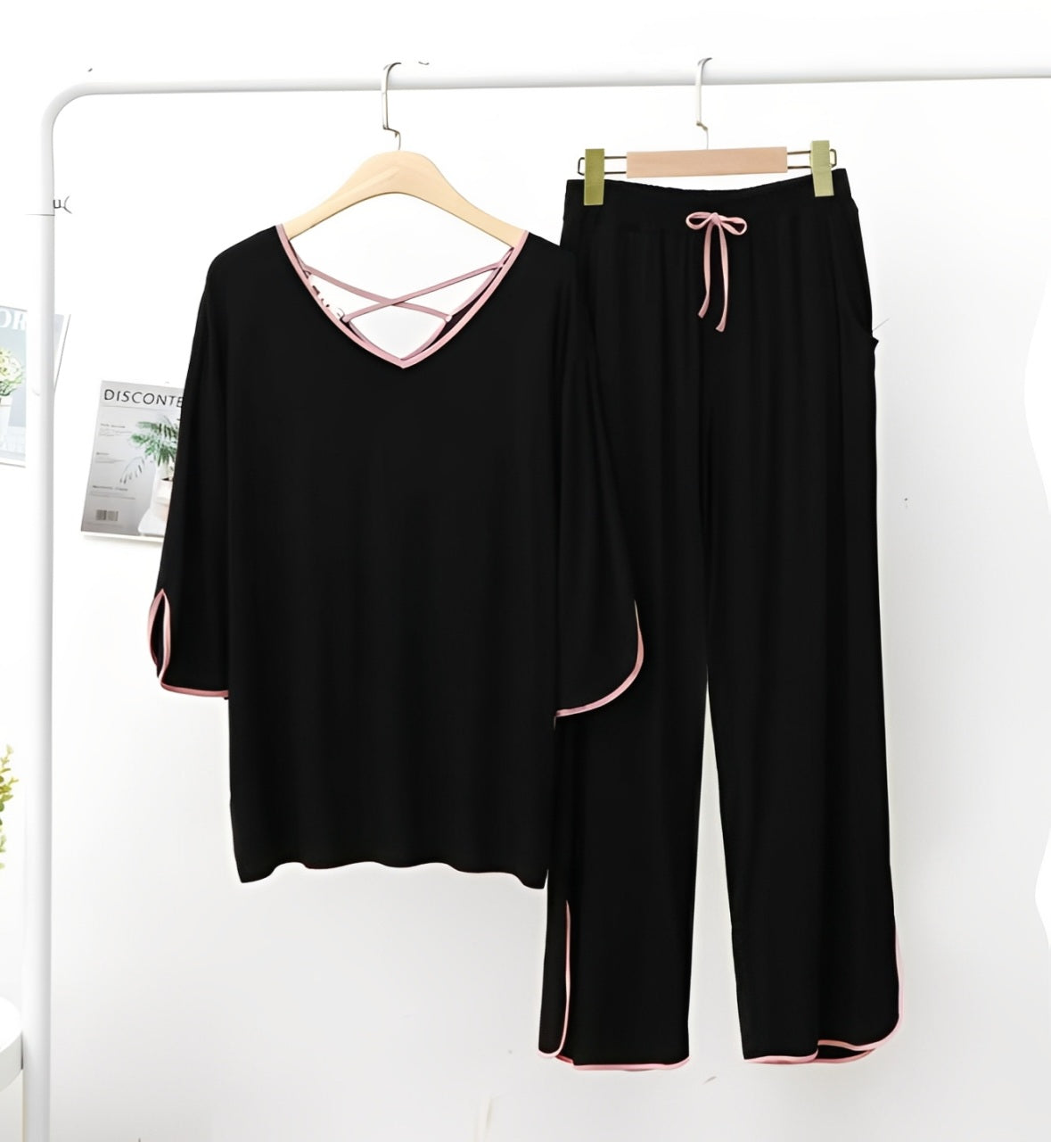 Plain Black with Pink Lace V Neck with Palazzo Pajama Set